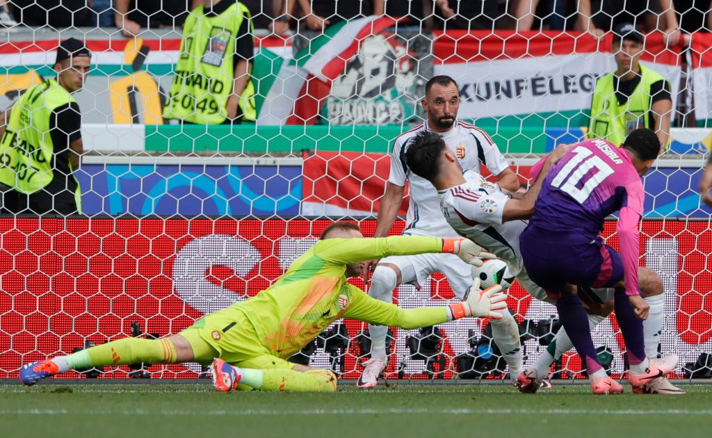 第22分鐘,維爾茨橫傳穆夏拉,后者直傳京多安,京多安對抗扛倒匈牙利后衛(wèi)奧爾班,主裁判沒有響哨。隨后京多安助攻穆夏拉攻門得手。經(jīng)視頻助理裁判(VAR)確認,進球有效,德國隊1:0領先。21歲114天的穆夏拉成為在歐錦賽歷史上前兩場比賽都打入進球的第二年輕的球員。