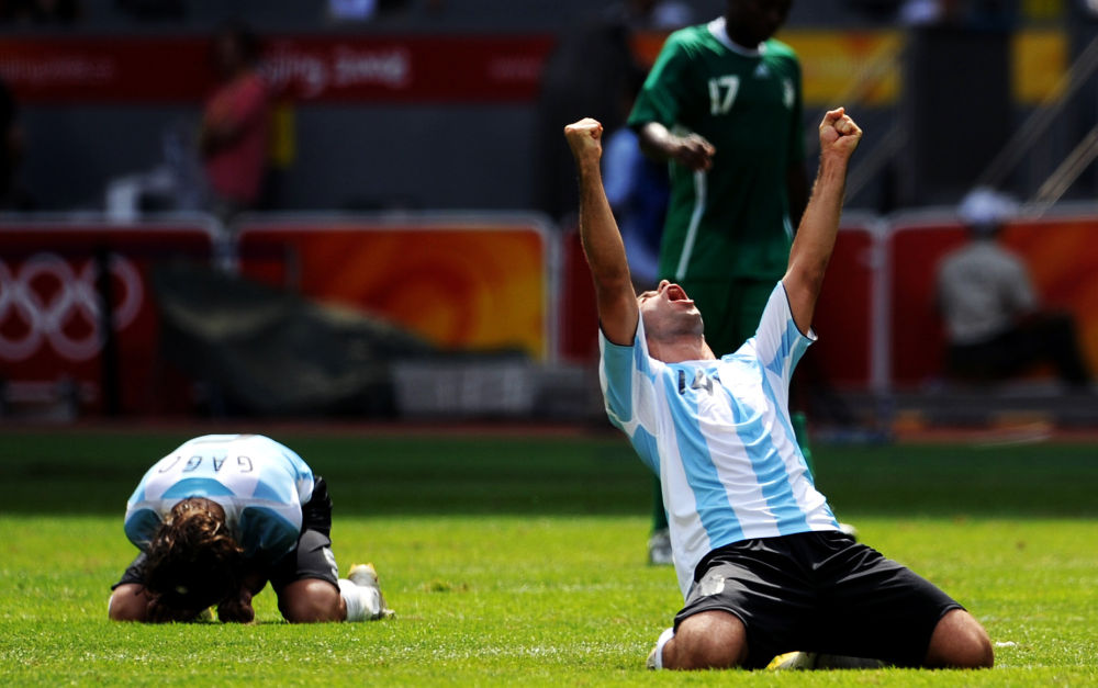 2008年8月23日,阿根廷隊球員馬斯切拉諾(右)慶祝勝利。當日,北京奧運會男子足球決賽在國家體育場——“鳥巢”舉行,阿根廷隊1:0戰(zhàn)勝尼日利亞隊獲得冠軍。新華社記者 楊磊 攝