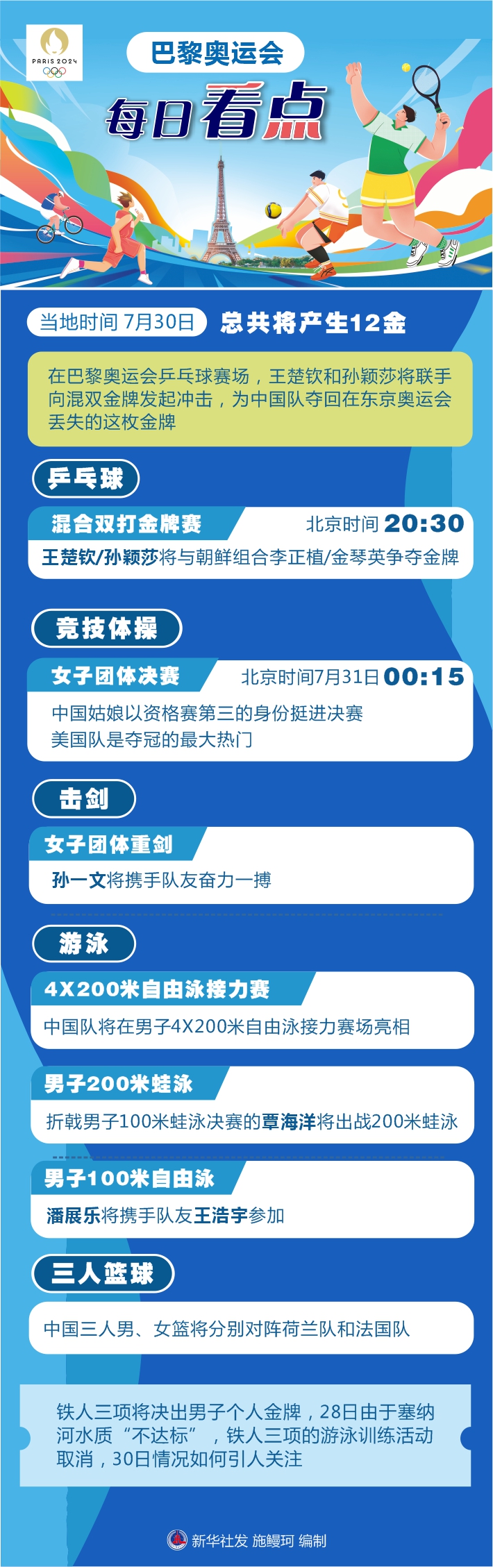 還有一些項目將拉開戰(zhàn)幕。中國三人男、女籃將分別對陣荷蘭隊和法國隊。鐵人三項將決出男子個人金牌,28日由于塞納河水質(zhì)“不達(dá)標(biāo)”,鐵人三項的游泳訓(xùn)練活動取消,30日情況如何引人關(guān)注。
