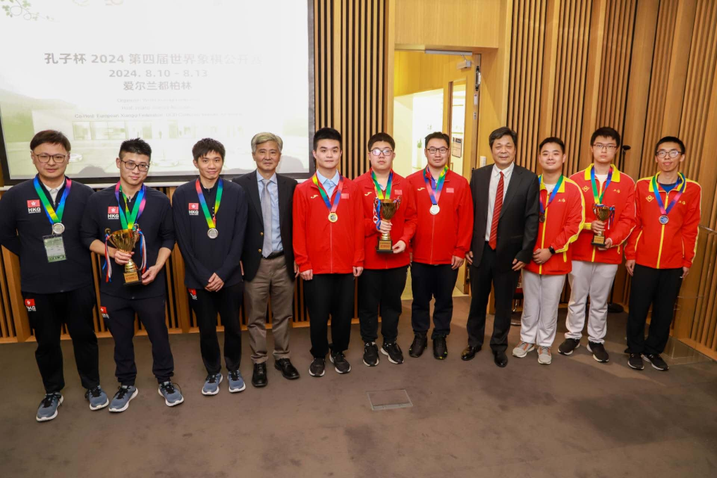 男子團(tuán)體前三名:中國隊(duì)(中)、中國香港隊(duì)(左一至左三)、中國上海棋院隊(duì)