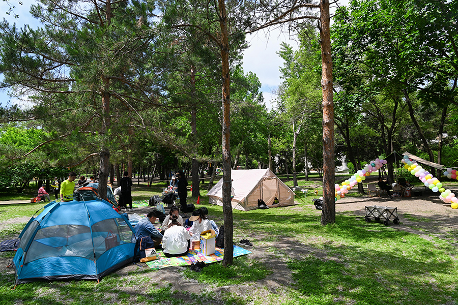 圖為6月4日拍攝的游人在太陽島風(fēng)景區(qū)的露營(yíng)區(qū)體驗(yàn)游玩。新華社發(fā)