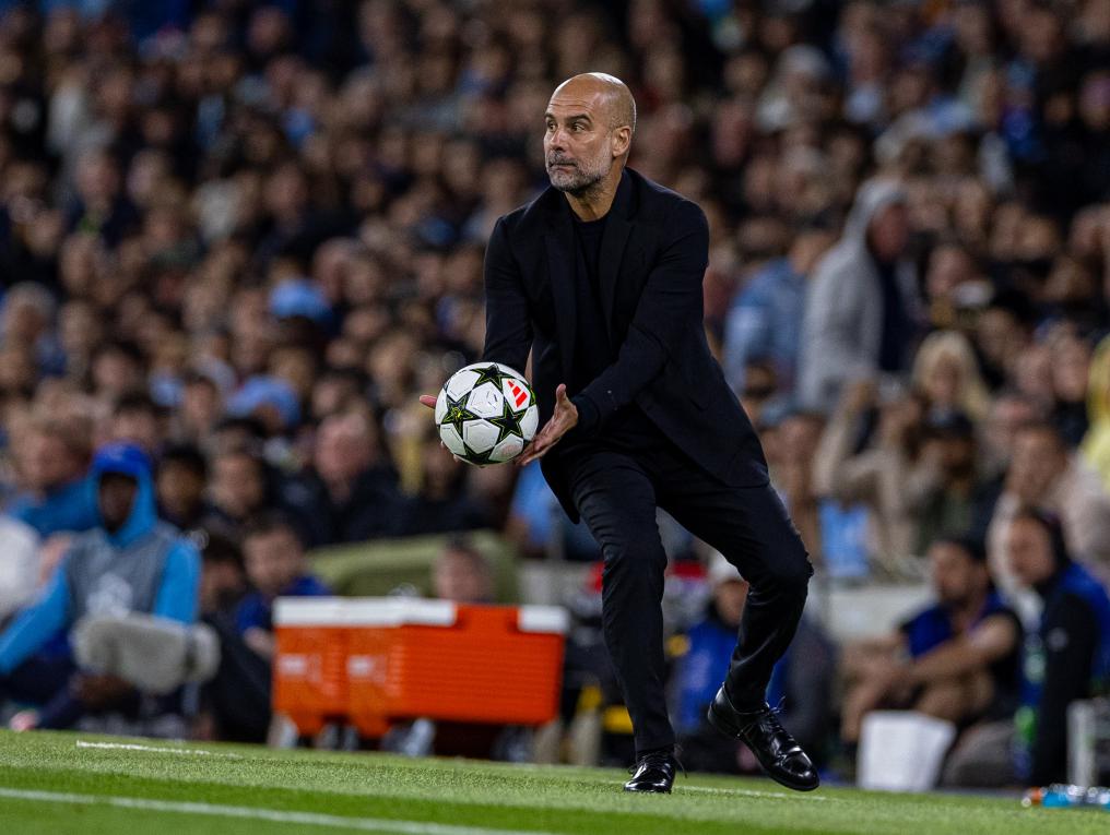 9月18日,曼徹斯特城隊(duì)主帥瓜迪奧拉在場(chǎng)邊撿球。新華社發(fā)