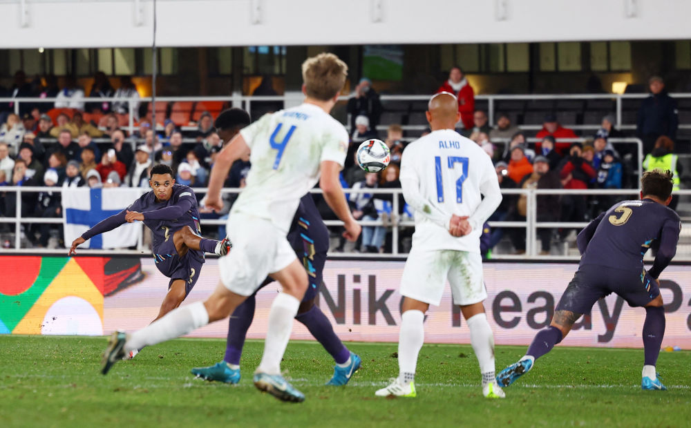 10月13日,英格蘭隊(duì)球員阿諾德(左一)主罰任意球破門。