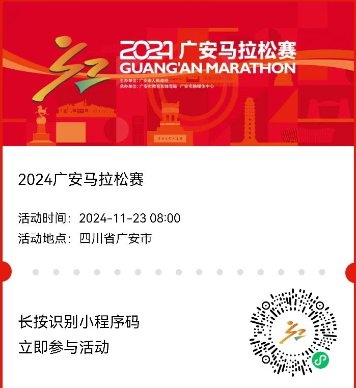 2024廣安馬拉松由中國田徑協(xié)會認證,廣安市人民政府主辦。賽事以“共富思源 奔跑廣安”為主題,規(guī)模20000人,共設置馬拉松(42.195公里)、半程馬拉松(21.0975公里)及歡樂跑(5公里)三個競賽項目。其中,馬拉松項目限報3000人,半程馬拉松項目限報7000人,歡樂跑項目限報10000人,各項目均報滿即止。本屆賽事除公開線上報名外,還將邀請全國媒體跑團、企業(yè)家跑團、知名人士跑團、川渝高校跑團、社會跑團等組成跑團方陣,為成渝地區(qū)雙城經(jīng)濟圈建設助陣。