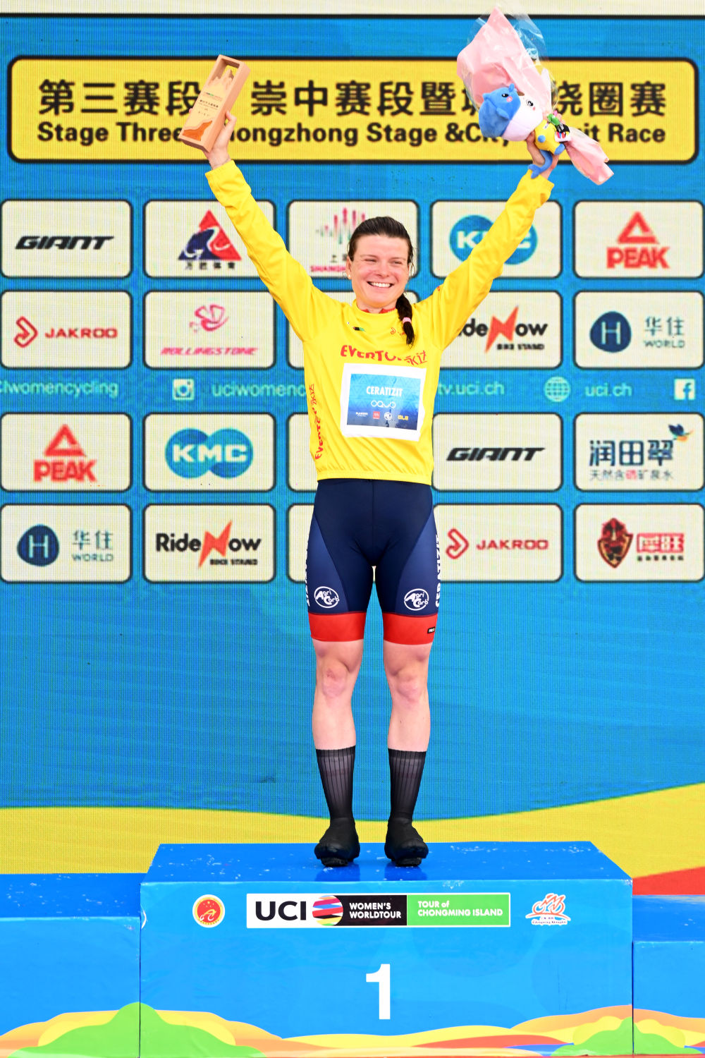 10月17日,冠軍森拉天時(shí)-WNT女子職業(yè)車隊(duì)選手瑪爾塔·拉赫在頒獎(jiǎng)儀式上。新華社發(fā)(陳浩明攝)