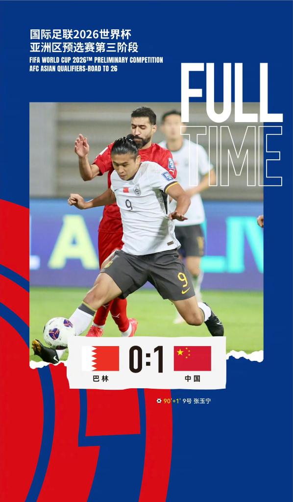 新華社麥納麥11月14日電 在14日進行的2026年美加墨世界杯亞洲區(qū)預(yù)選賽18強賽第五輪比賽中,張玉寧在補時階段攻入制勝一球,幫助中國國家男子足球隊在客場1:0擊敗巴林隊。賽后,張玉寧在場邊接受采訪時表示,進球是對全隊所有人的嘉獎。