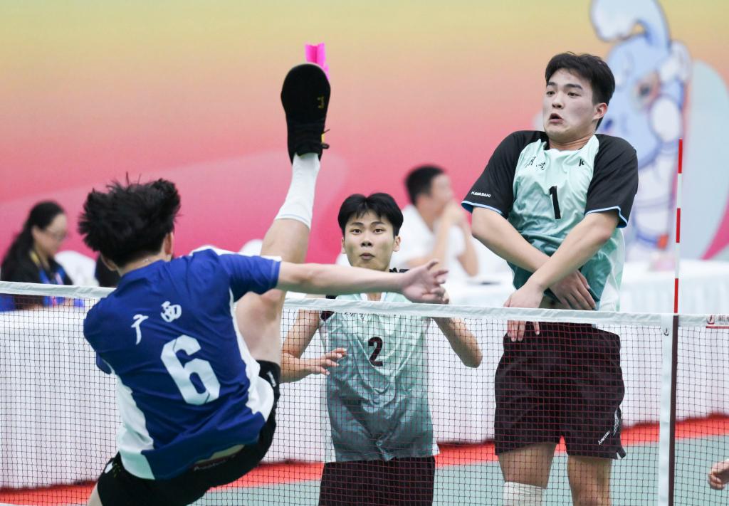 23日,第十二屆全國少數民族傳統(tǒng)體育運動會(以下簡稱“運動會”)毽球項目開賽。場地上,運動員們雙腿如雙臂般靈活,時而飛腿將毽球橫掃過網,時而腳底板扣球絕殺,時而高抬腿一記倒鉤讓對手措手不及……