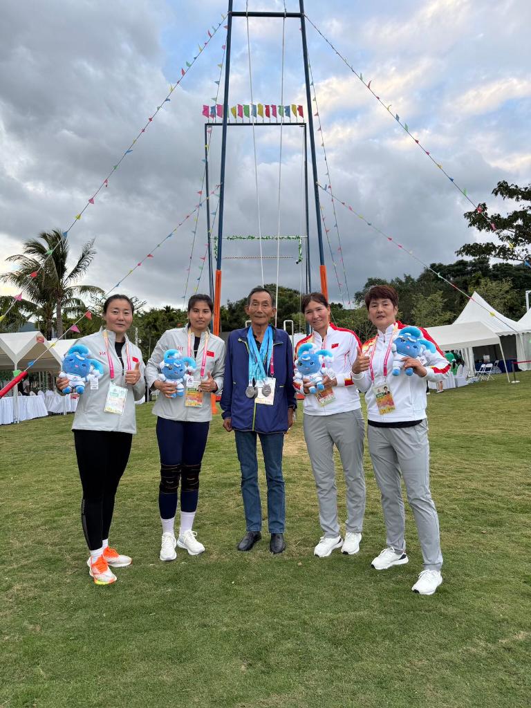 23日,新疆代表團(tuán)獲得本屆運動會秋千項目55kg雙人觸鈴比賽的三等獎。頒獎儀式后,師徒三人回到休息區(qū),收拾東西準(zhǔn)備離開。那一刻,天空由陰轉(zhuǎn)晴,陽光溫暖耀眼,掛在兩位新疆“古麗”身上的獎牌,閃閃發(fā)光。