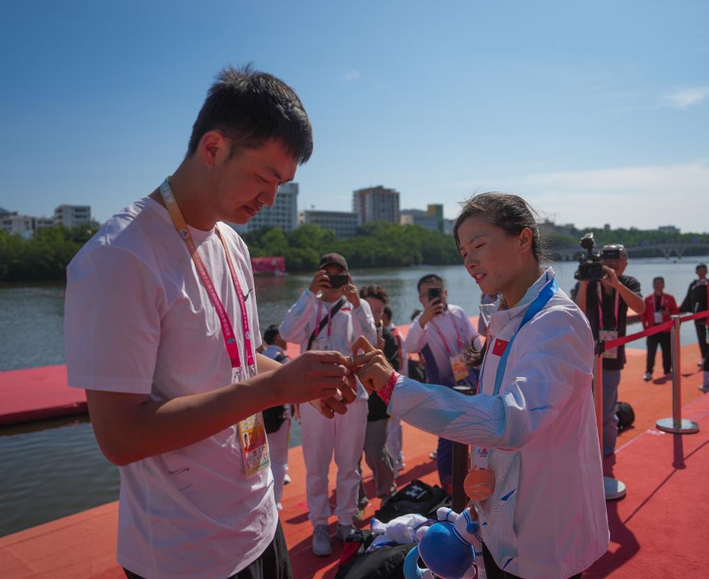 11月28日,何國(guó)潤(rùn)(右)的男朋友向她求婚。當(dāng)日,在海南省三亞市舉行的第十二屆全國(guó)少數(shù)民族傳統(tǒng)體育運(yùn)動(dòng)會(huì)獨(dú)竹漂女子組200米直道賽頒獎(jiǎng)儀式后,海南隊(duì)選手何國(guó)潤(rùn)的男朋友在頒獎(jiǎng)儀式現(xiàn)場(chǎng)向她求婚,上演溫情一幕。新華社發(fā)(杜笑微攝)