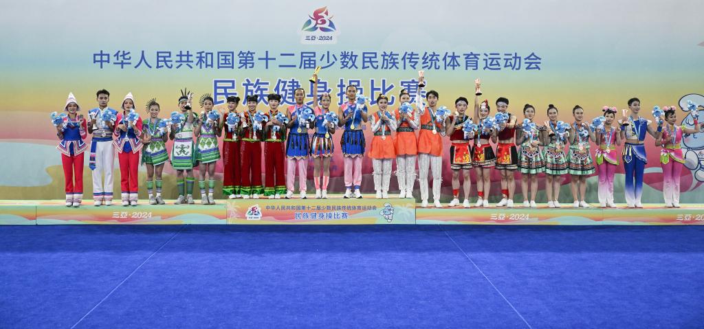 11月28日,這是第十二屆全國(guó)少數(shù)民族傳統(tǒng)體育運(yùn)動(dòng)會(huì)民族健身操自選套路(輕器械)頒獎(jiǎng)儀式現(xiàn)場(chǎng)。新華社記者 孫凡越 攝