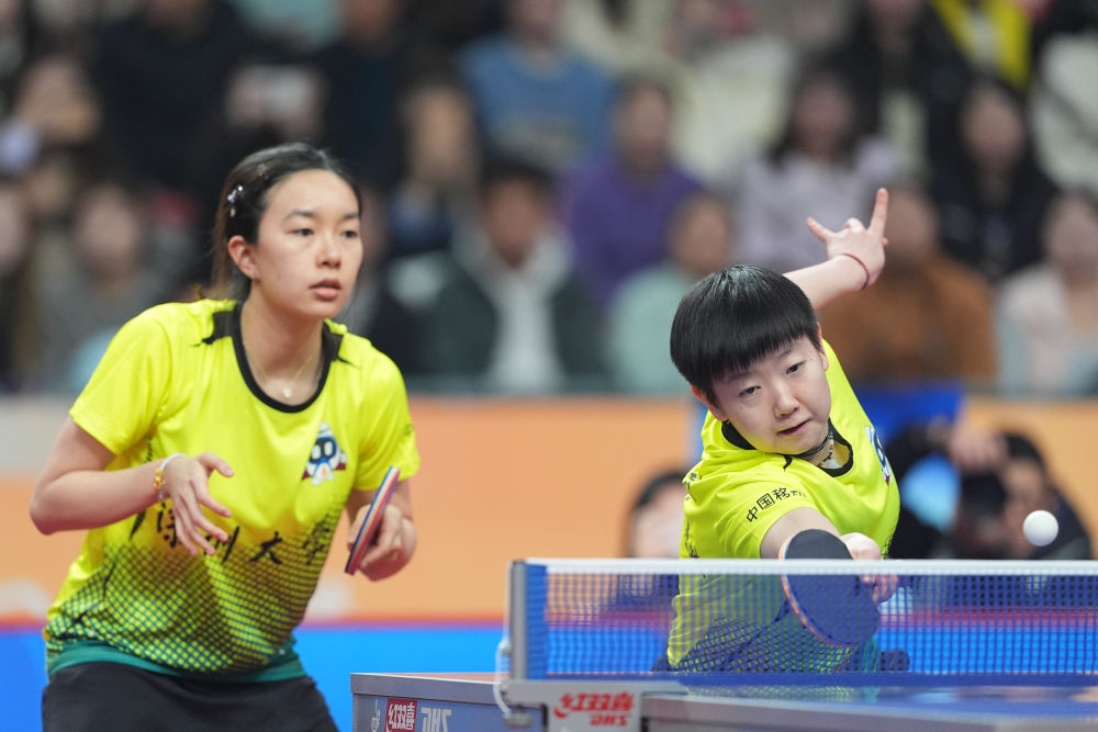 12月12日,深圳大學(xué)隊(duì)組合孫穎莎(右)/吳詠琳在女子團(tuán)體雙打比賽中。新華社記者 薛宇舸 攝