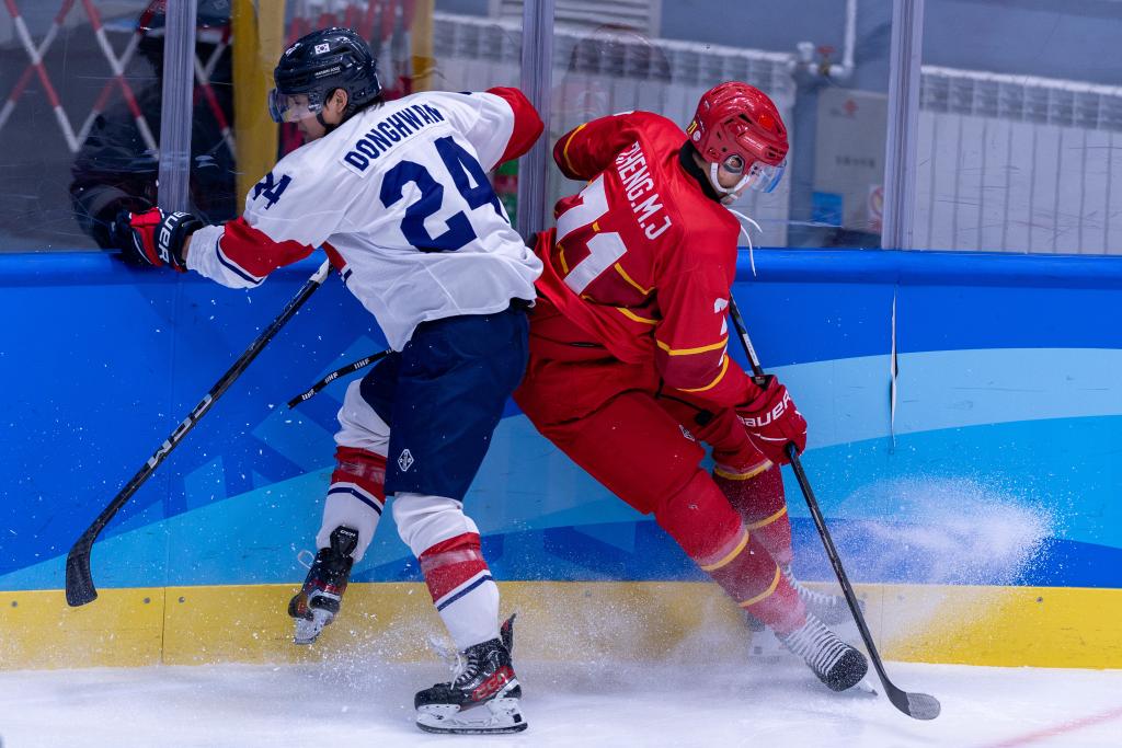 2月4日,中國隊球員鄭明舉(右)在比賽中拼搶。新華社記者 黃偉 攝