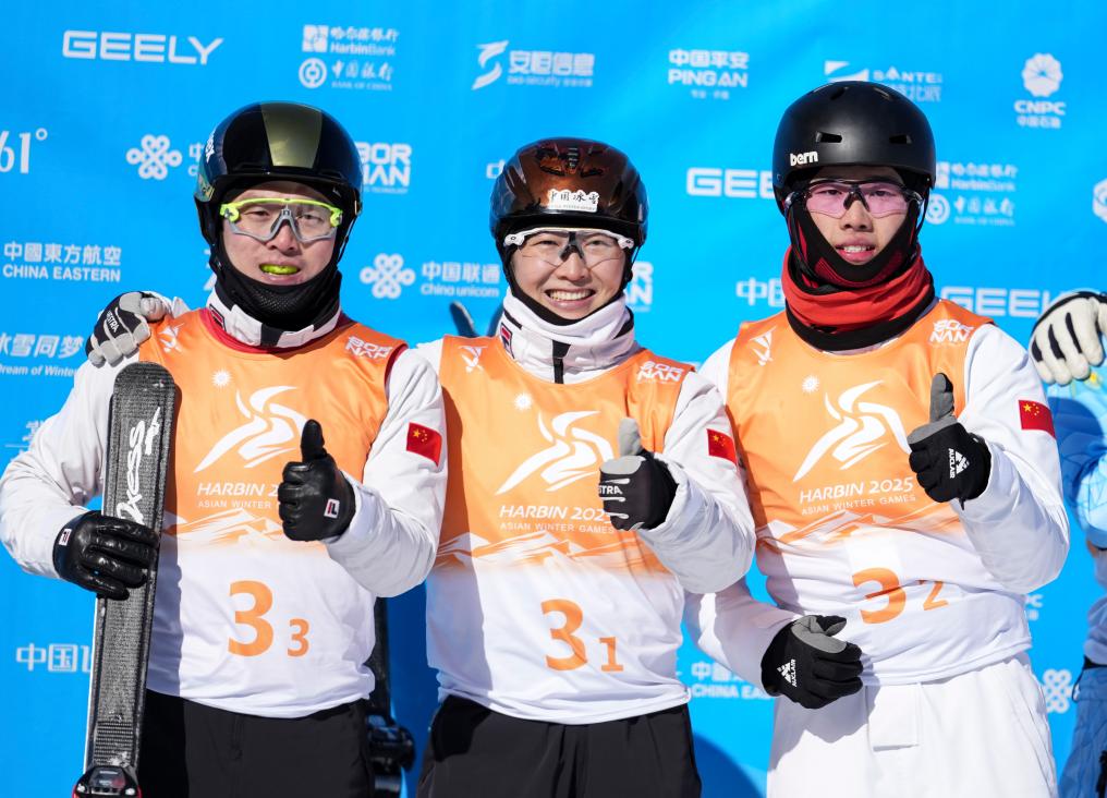 2月10日,齊廣璞、徐夢(mèng)桃和李心鵬(從左至右)在賽后合影。當(dāng)日,在亞布力舉行的第九屆亞冬會(huì)自由式滑雪空中技巧混合團(tuán)體決賽中,中國(guó)隊(duì)奪冠。新華社記者 賴向東 攝
