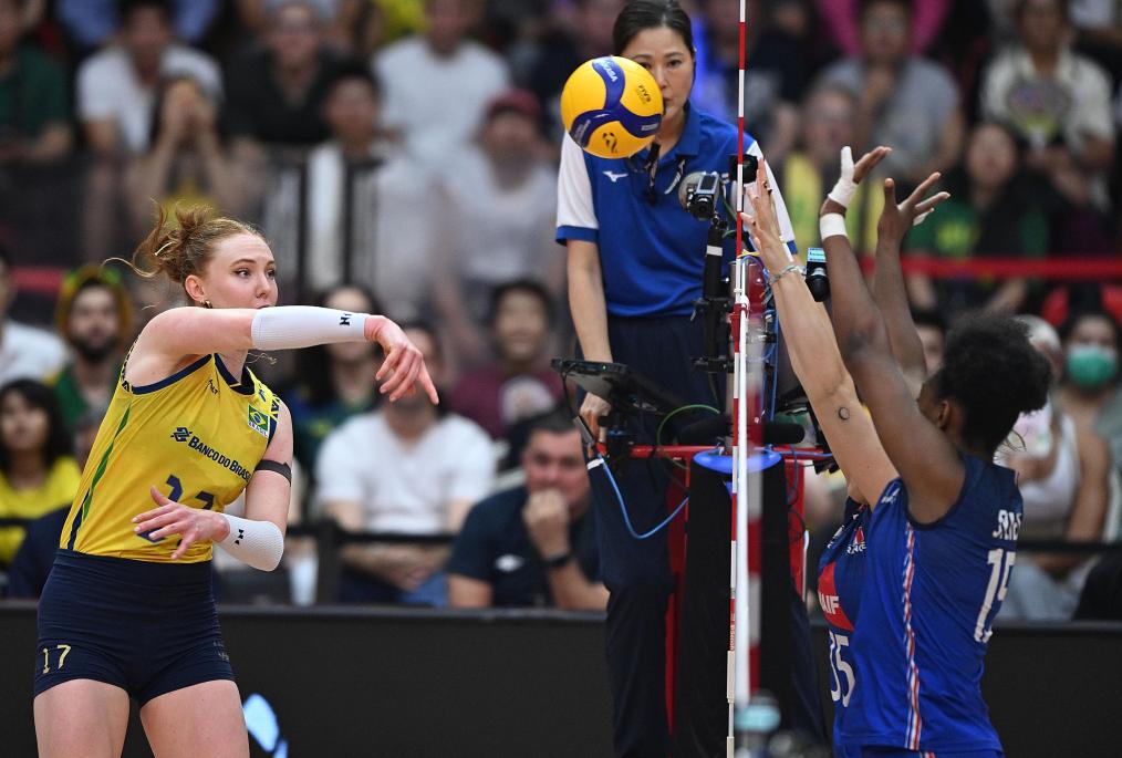巴西隊(duì)在小組賽中曾以3:2險(xiǎn)勝法國隊(duì),這次她們以27:25、33:31和25:19勝出。前兩局的爭奪異常激烈,第二局更是一波三折。法國隊(duì)一度取得19:15的優(yōu)勢,卻被巴西隊(duì)連得4分追成19平。此后,巴西隊(duì)以24:22率先拿到局點(diǎn),卻被法國隊(duì)連得3分以25:24反超。領(lǐng)先幾度易手、雙方又多次錯(cuò)過局點(diǎn)之后,比分來到31平。關(guān)鍵時(shí)刻,庫迪耶斯扣球成功,接下來加比在反擊中推攻得分,幫助巴西隊(duì)以33:31險(xiǎn)勝。