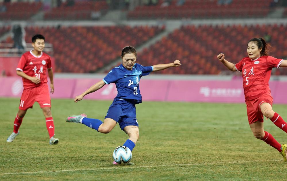 11月4日,山東隊球員孫方欣(中)在比賽中射門。新華社記者 王鵬 攝