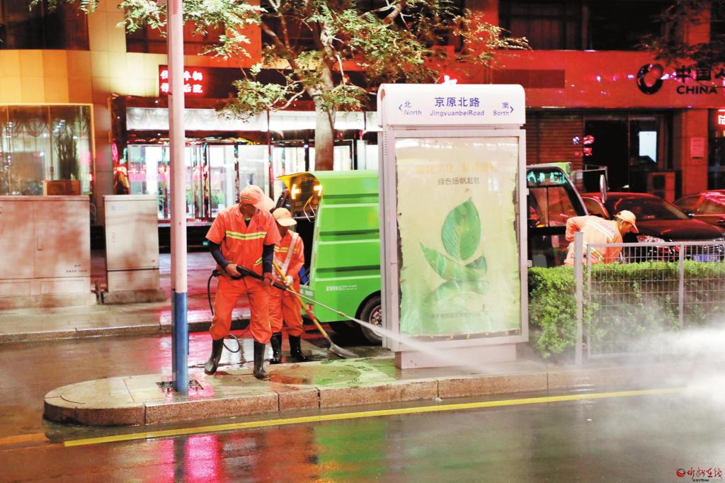 九月九日晚,原平市環(huán)衛(wèi)工人利用晚上路上人少車少的有利時機,清洗京原北路的道路死角。 本報通訊員 攝