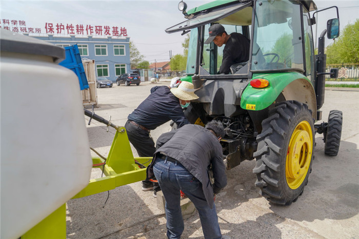 △在吉林省四平市梨樹縣康達(dá)農(nóng)機農(nóng)民專業(yè)合作社,農(nóng)民在調(diào)試免耕播種機。