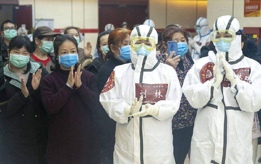 2020年3月8日,女性醫(yī)護人員和女性患者共同參加武昌方艙醫(yī)院內“三八”婦女節(jié)活動 (新華社記者熊琦 攝)