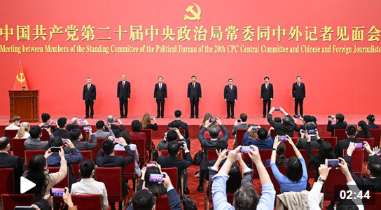 在中國共產(chǎn)黨第二十屆中央委員會(huì)第一次全體會(huì)議上當(dāng)選的中共中央總書記習(xí)近平和中共中央政治局常委李強(qiáng)、趙樂際、王滬寧、蔡奇、丁薛祥、李希,23日中午在人民大會(huì)堂同采訪中共二十大的中外記者親切見面。