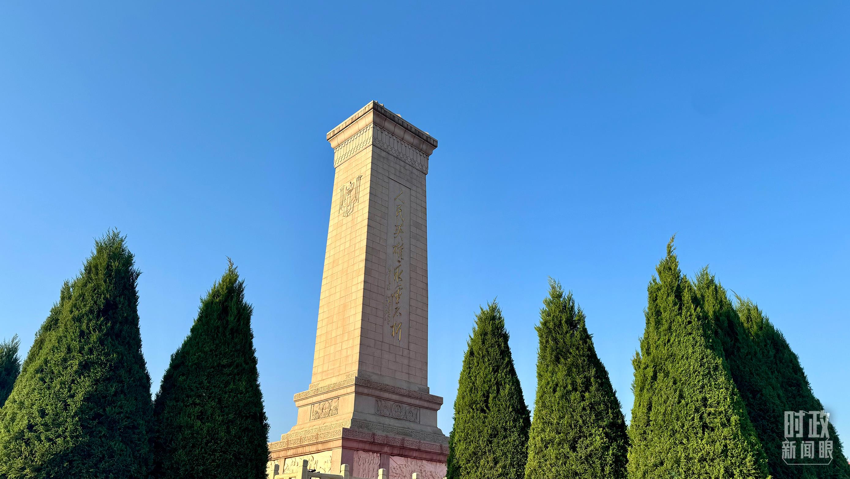 18名禮兵穩(wěn)穩(wěn)抬起花籃,緩步走向人民英雄紀念碑,將花籃擺放在紀念碑基座上。