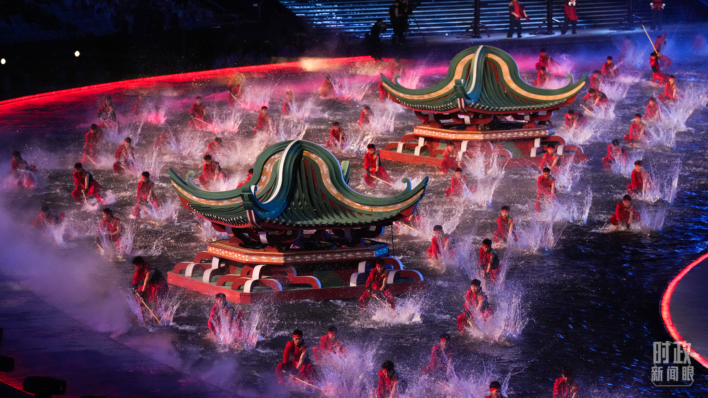 廣東奧體中心內(nèi),一幅運(yùn)用人工智能技術(shù)、展現(xiàn)嶺南瑰麗風(fēng)光的“長卷”徐徐鋪展。開幕式包括入場(chǎng)儀式、奏唱國歌、參賽運(yùn)動(dòng)員等代表宣誓、文體展演、主火炬點(diǎn)燃儀式等多個(gè)環(huán)節(jié)。其中,展現(xiàn)粵港澳三地?cái)y手合辦的“同心”“融合”等元素,成為這場(chǎng)開幕式的一大特點(diǎn)。