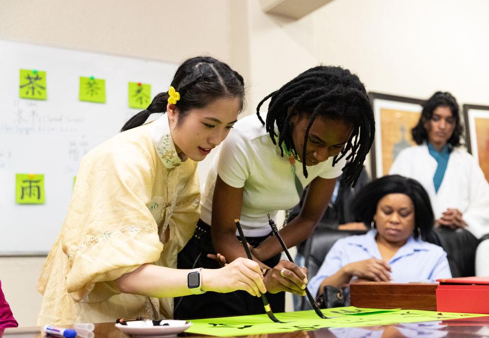 △2025年4月17日,在南非約翰內(nèi)斯堡,學生與孔子學院志愿者在“國際中文日”活動上寫毛筆字。