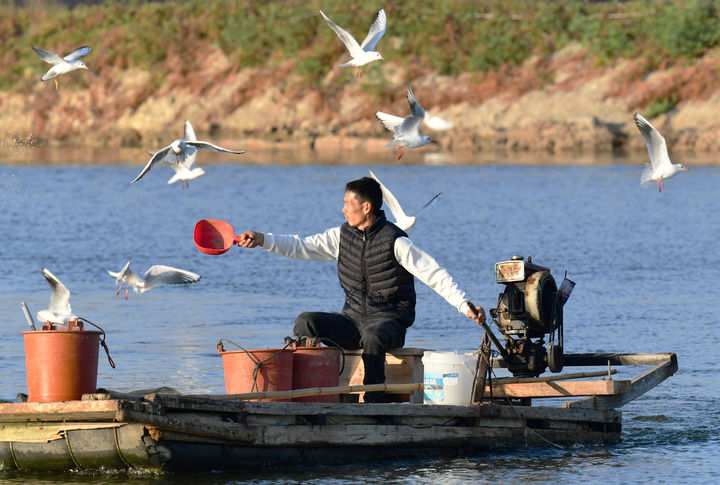 2025年12月10日,福建省漳州市佛曇鎮(zhèn)東坂村河豚養(yǎng)殖戶(hù)在給河豚投喂食物。新華社記者 魏培全 攝