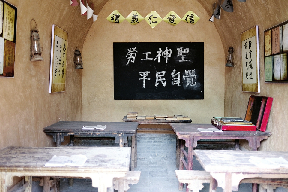 推開堆云洞一層側院展廳木門,明媚的陽光照進教室,黑板上“勞工神圣平民自覺”8個粉筆字赫然在目,老舊的桌椅、殘留的坑道、銹跡斑斑的馬燈,雖已被時間抹去了原有的模樣,但仍時刻警醒著后人勿忘國恥。
