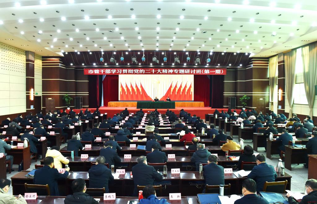 市管干部學(xué)習(xí)貫徹黨的二十大精神專題研討班現(xiàn)場。馮曉磊 攝 2月6日,市管干部學(xué)習(xí)貫徹黨的二十大精神專題研討班在市委黨校開班。市委書記朱曉東出席開班式并講話。他強(qiáng)調(diào),要持續(xù)在全面學(xué)習(xí)、全面把握、全面落實(shí)黨的二十大精神上下功夫,真正做到認(rèn)識充分、思想統(tǒng)一,行動見效、落實(shí)有力,把學(xué)習(xí)宣傳貫徹黨的二十大精神煥發(fā)出的熱情,轉(zhuǎn)化為履職盡責(zé)、真抓實(shí)干的具體行動,把學(xué)習(xí)所獲切實(shí)運(yùn)用到中國式現(xiàn)代化忻州實(shí)踐當(dāng)中。市委副書記、市長李建國主持開班式。