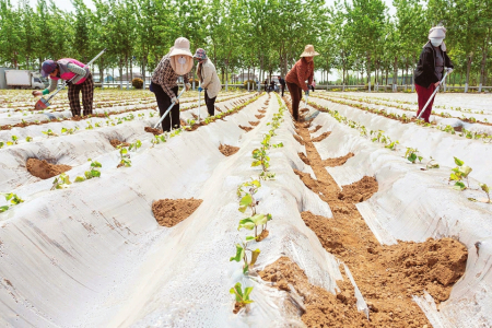 四月十一日,夏縣裴介鎮(zhèn)墻下村農(nóng)田里,農(nóng)民正在對紅薯秧苗實施圍土作業(yè)。眼下正是春耕春播時節(jié),當(dāng)?shù)剞r(nóng)民加緊實施護苗管理,確保紅薯增產(chǎn)增收。