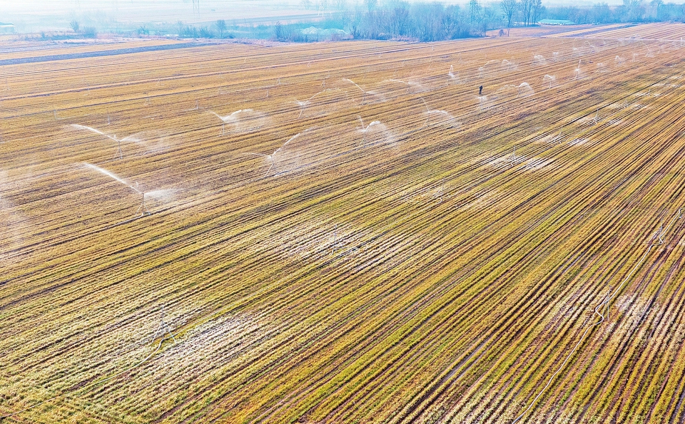 2月28日,臨汾市襄汾縣鄧莊鎮(zhèn)澗溝村,農(nóng)民采用智能水肥一體化技術(shù)對(duì)麥田進(jìn)行噴灌作業(yè)。李現(xiàn)俊攝