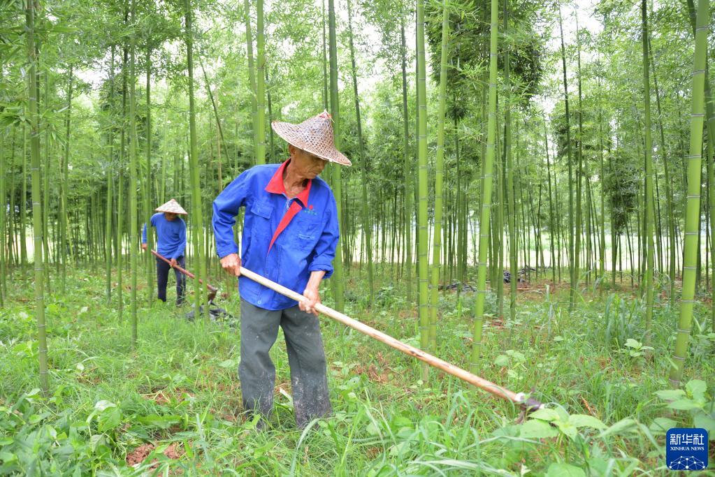 新華社福州6月22日電題:福建建甌:綠色竹山漸成幸?!翱可健?/strong> 新華社記者張華迎 仲夏時(shí)節(jié),閩北山區(qū)萬物并秀。清晨時(shí)分,福建省建甌市東峰鎮(zhèn)井岐村河畔,一片片青翠欲滴的雷竹隨風(fēng)搖曳,沙沙作響。趁著天氣晴好,井岐村雷竹種植大戶葉揚(yáng)杰帶著幾位村民拿著鋤頭在竹林里鋤草、平整土地、施肥,忙得熱火朝天。