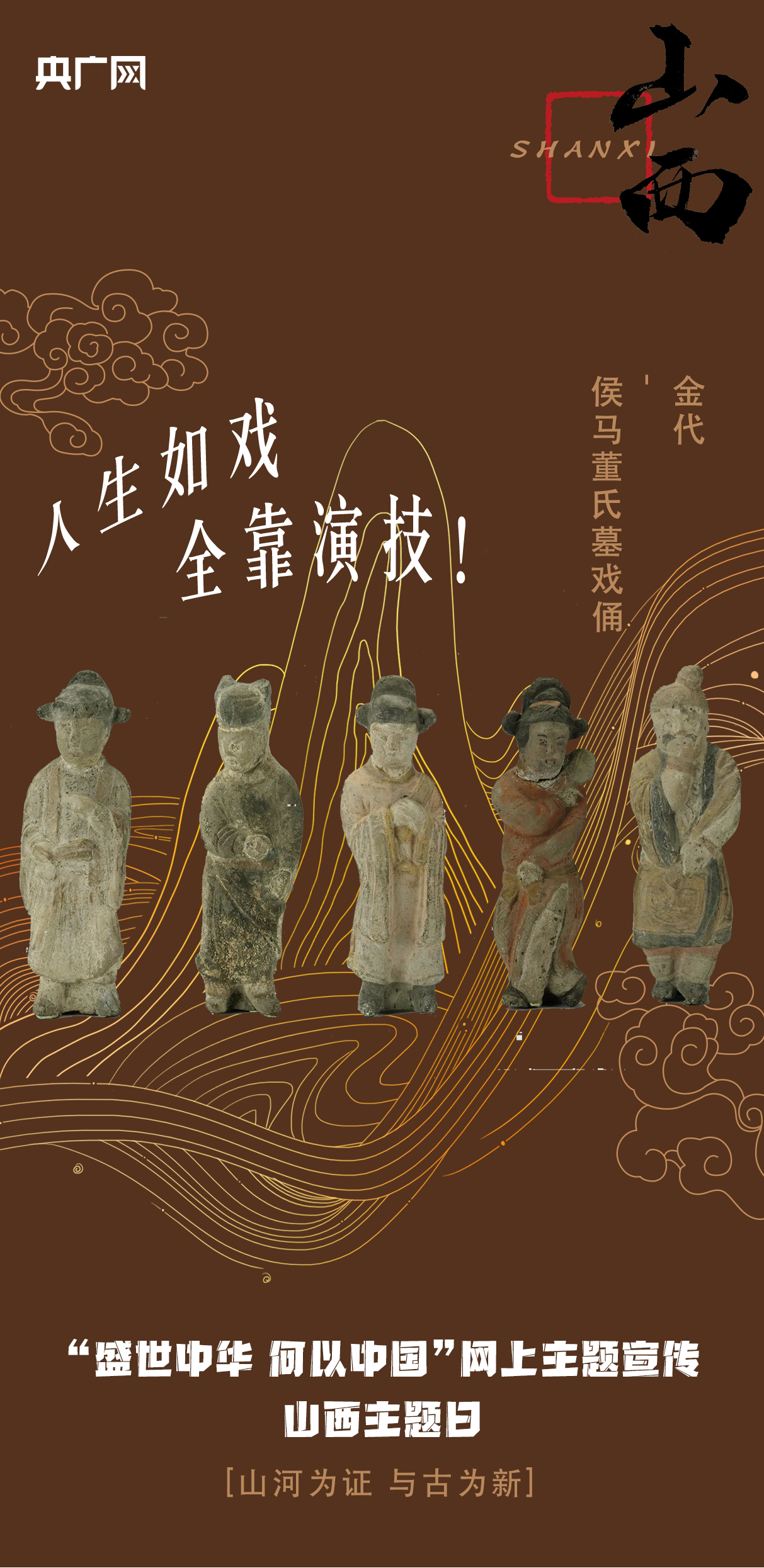 董氏墓戲俑。1959年出土于山西臨汾侯馬市西郊牛莊村的金代董明磚雕墓,一組5件,高約20厘米,5個戲俑并列一排。