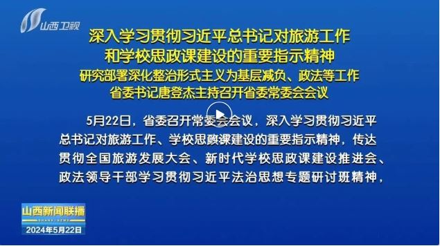 山西日報報道 5月22日,省委召開常委會會議,深入學習貫徹習近平總書記對旅游工作、學校思政課建設(shè)的重要指示精神,傳達貫徹全國旅游發(fā)展大會、新時代學校思政課建設(shè)推進會、政法領(lǐng)導干部學習貫徹習近平法治思想專題研討班精神,研究部署深化整治形式主義為基層減負工作。省委書記唐登杰主持會議。