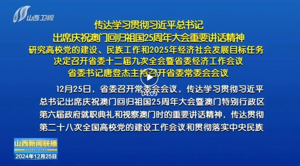 山西日報(bào)報(bào)道 12月25日,省委召開常委會會議,傳達(dá)學(xué)習(xí)貫徹習(xí)近平總書記出席慶祝澳門回歸祖國25周年大會暨澳門特別行政區(qū)第六屆政府就職典禮和視察澳門時(shí)的重要講話精神,傳達(dá)貫徹第二十八次全國高校黨的建設(shè)工作會議和貫徹落實(shí)中央民族工作會議精神經(jīng)驗(yàn)交流會精神,研究2025年經(jīng)濟(jì)社會發(fā)展主要指標(biāo)及財(cái)政收支計(jì)劃安排,決定于近日召開省委十二屆九次全會暨省委經(jīng)濟(jì)工作會議。省委書記唐登杰主持會議。