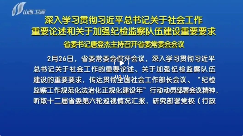 山西日報(bào)報(bào)道 2月26日,省委常委會(huì)召開會(huì)議,深入學(xué)習(xí)貫徹習(xí)近平總書記關(guān)于社會(huì)工作的重要論述、關(guān)于加強(qiáng)紀(jì)檢監(jiān)察隊(duì)伍建設(shè)的重要要求,傳達(dá)貫徹全國社會(huì)工作部長會(huì)議、“紀(jì)檢監(jiān)察工作規(guī)范化法治化正規(guī)化建設(shè)年”行動(dòng)動(dòng)員部署會(huì)議精神,聽取十二屆省委第六輪巡視情況匯報(bào),研究部署黨校(行政學(xué)院)工作。省委書記唐登杰主持會(huì)議。