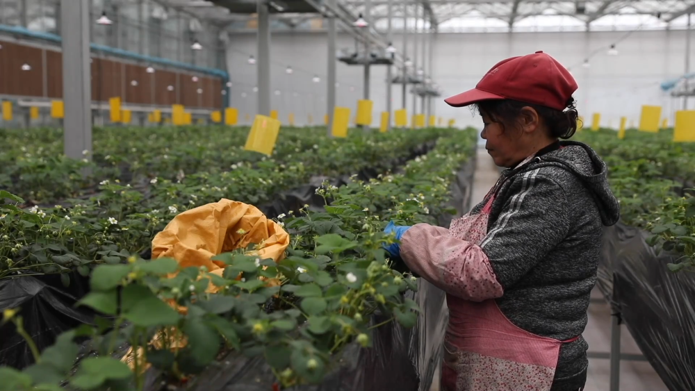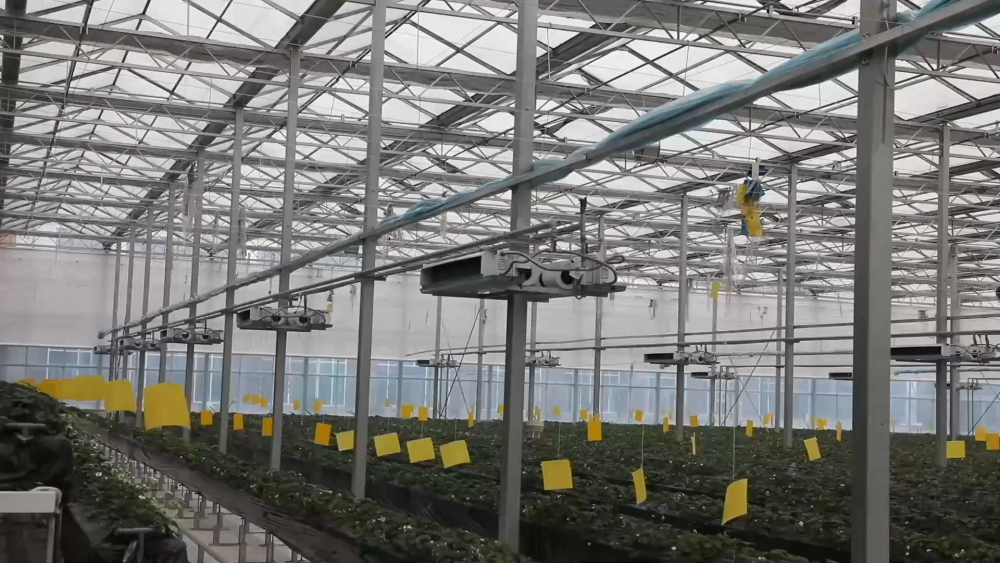 智慧農(nóng)場(chǎng)玻璃溫室現(xiàn)共種植三個(gè)品種、八萬(wàn)株草莓,均為自主繁育的草莓苗??茖W(xué)種植促進(jìn)了豐產(chǎn),兩座玻璃溫室均可實(shí)現(xiàn)一年四季連續(xù)生產(chǎn)。
