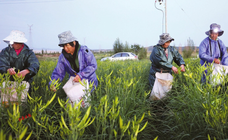 夜色如墨,黃花地里逐漸閃爍起點點星光,那是采摘工頭上佩戴的射燈亮了起來,他們?nèi)蔽溲b,長袖長褲、雨靴、雨衣、防蟲帽、頭燈一應(yīng)俱全。