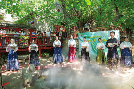 在太山景區(qū)售票廳里,背誦古詩詞免門票的活動(dòng)吸引了不少18周歲以下的學(xué)生參加,大家通過轉(zhuǎn)盤選定需要背誦的古詩詞,完成背誦即可獲得門票一張。“和同學(xué)們正好一塊兒來了,通過參加這個(gè)活動(dòng),弘揚(yáng)我們的傳統(tǒng)文化,是非常有意義的?!苯衲晔钇冢骄皡^(qū)面向廣大學(xué)生推出皮影戲、手工DIY印章、拓印等非遺體驗(yàn)活動(dòng)。同時(shí),景區(qū)還準(zhǔn)備了2000多套漢服,免費(fèi)為游客提供。
