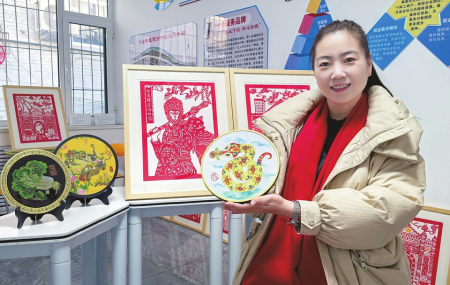 當(dāng)日,下站街道文化活動(dòng)室五顏六色、惟妙惟肖的彩色剪紙作品,也讓之前只見(jiàn)過(guò)紅色剪紙作品的記者眼前一亮?!斑@是染色剪紙。制作之前,需要先在白紙上起稿。剪出來(lái)后,會(huì)根據(jù)不同部位的特點(diǎn)進(jìn)行上色,讓作品更加生動(dòng)、更加活靈活現(xiàn)?!倍绶冀榻B,這次剪紙活動(dòng)也是街道“非遺賀新春”主題活動(dòng)的一部分,圍繞蛇年主題系列進(jìn)行創(chuàng)作。