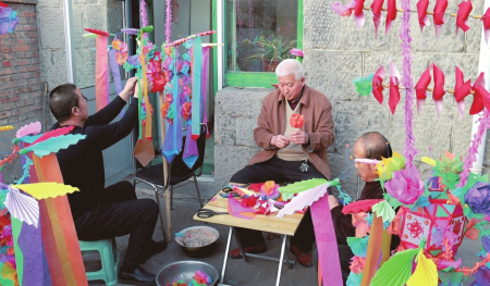記者在現(xiàn)場看到,制作好的炮燈上有飄帶、繡球等裝飾,每盞炮燈不盡相同,畫有禾苗、動物等不同圖案,寓意五谷豐登、六畜興旺,“孔雀展翅”“雄羊抵頭”“駿馬奔馳”等主題的炮燈活靈活現(xiàn)?!霸谖业挠洃浝铮覀兇迥昴甓加兄谱魇止づ跓舻膫鹘y(tǒng),保存好的炮燈能用上兩年,燈架能代代相傳,我們有義務(wù)將這種技藝傳承發(fā)揚(yáng)下去……”67歲的村民翟慶如是村里制作炮燈的“行家”,他現(xiàn)場拿起一張彩紙給記者折起了炮燈上的裝飾。