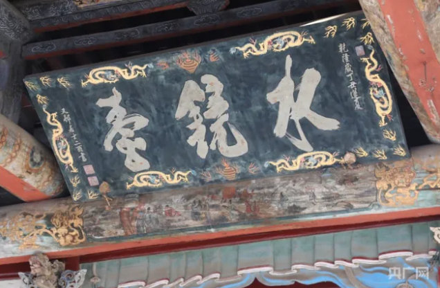 “水鏡臺(tái)”匾。水鏡臺(tái)是一座古戲臺(tái),懸掛匾額“水鏡臺(tái)”。“水鏡”之名取自《漢書》名句“清水明鏡不可以形逃”,寓意為人世間的善惡忠奸盡人皆知。此匾由清乾隆翰林、著名書法家楊二酉所題,書體清秀,筆力遒勁。