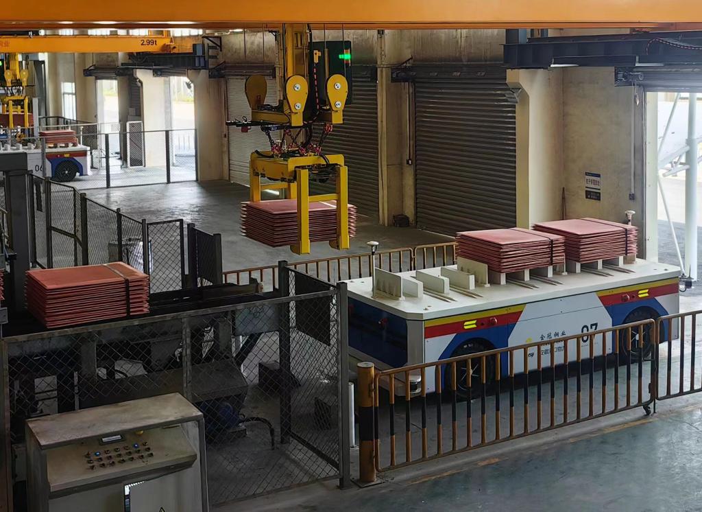 圖為金冠銅業(yè)分公司電解車間里,正在作業(yè)的AGV小車。(吳家富攝)